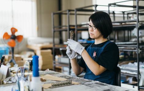私たちの部署には現在4名の社員が所属し、その全員が女性です。事務作業といっても、伝票や書類の作成やお客様の応対などの業務だけでなく、材料の確認や現場への指示、製品の検査から梱包、納品など、さまざまな業務を担当しています。ですから、私たちのユニホームは事務服ではなく作業着。現場での製造以外の作業全般を担っています。